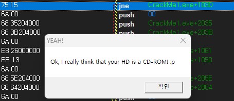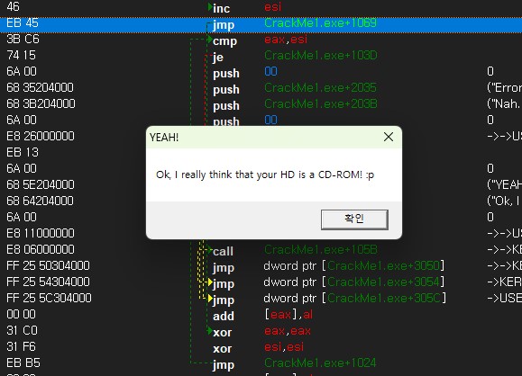 GetDriveTypeA 함수를 볼 수 있으며, 밑의 cmp eax, esi 를 통해 비교 후 je를 통해 성공메시지로 점프한다.