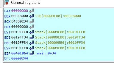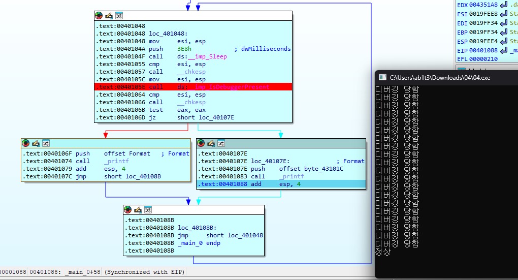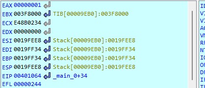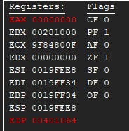 eax가 1로 세팅된 모습을 볼 수 있다. 즉 디버깅 중이라는 것.