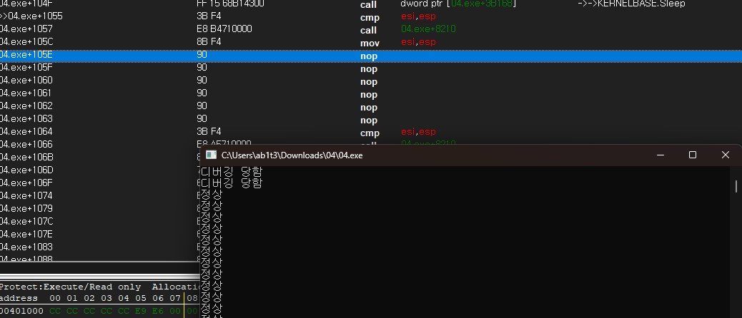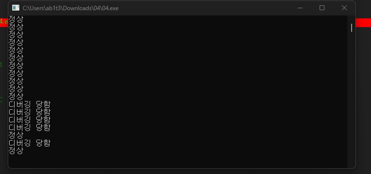 "정상"이라는 텍스트를 출력해주다 디버깅을 감지하면 "디버깅 당함"을 출력해주고 있다.