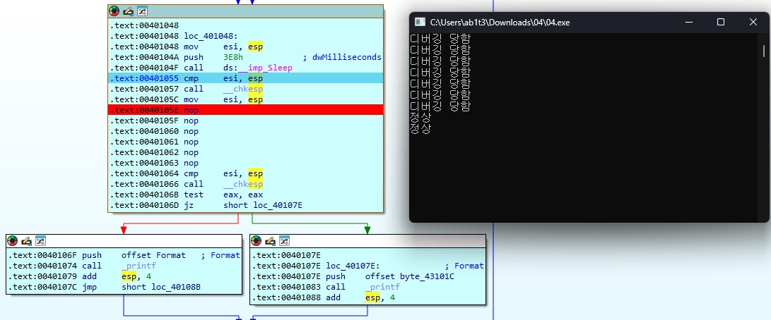 "정상" 또는 "디버깅 당함"을 출력해주는 부분이다. 디버깅당하고 있을땐 왼쪽으로 진행되었다