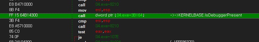그냥 바로 보인다. 역시 예상대로 IsDebuggerPresent를 사용하고있다.