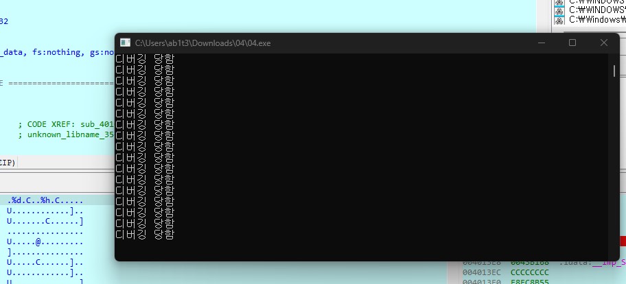 브레이크포인트를 걸고 실행시켜보면 디버깅 당했다고 무수히 외치는 걸 볼 수 있다.