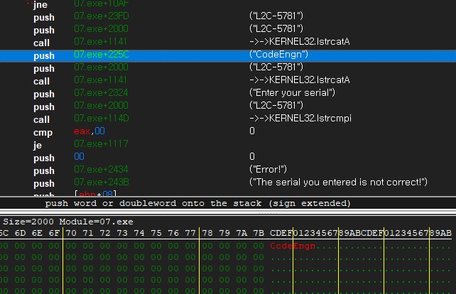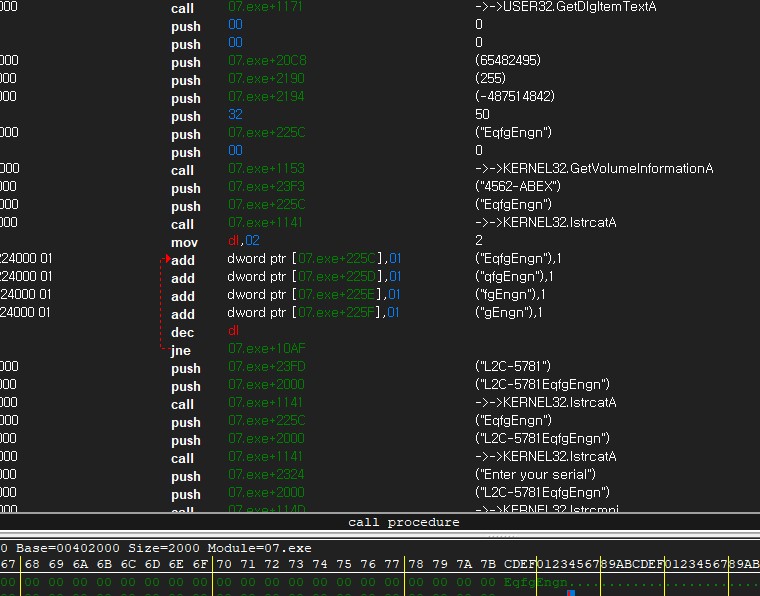 07.exe + 225c 에서 8바이트 만큼 차지하는 CodeEngn은 EqfgEngn으로 바뀌었다고 볼 수 있고,
