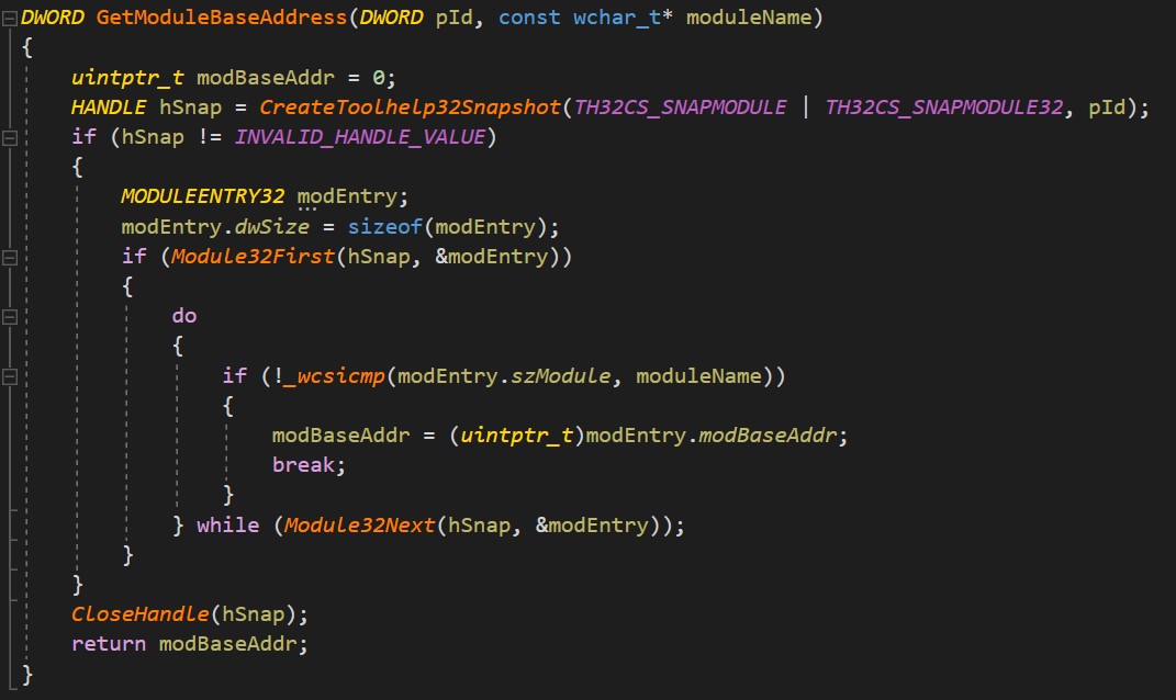 Module32First로 모듈에 대한 정보를 검색하고 szModule로 내가 찾는 모듈과 이름이 같은지 비교합니다.