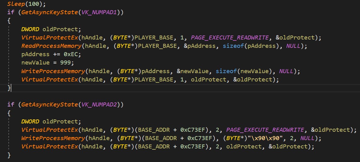 HANDLE을 얻고, PID를 구해 접근권한을 얻어 메모리보호 속성을 변경해주고 메모리를 읽어와 오프셋을 더해 계산후