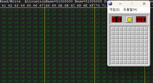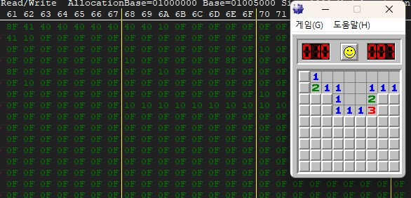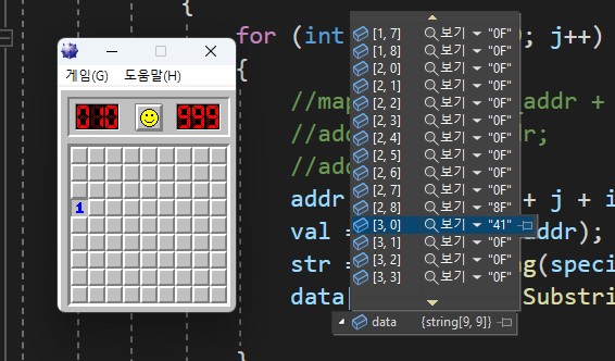 이어서이제 메모리를 읽어와서, 2차원 배열에 값을 넣어주어야 합니다. 프로그램을 열어줍니다. 실시간으로 볼 수 있게 띄워주겠습니다.전 포스팅에서 봤다시피 0x20 은 32입니다.시작주소 + j