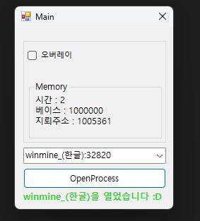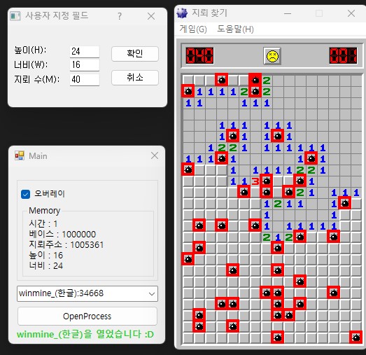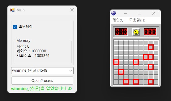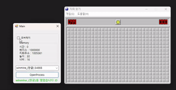 https://imoracle.tistory.com/51 [Game] 지뢰찾기 월핵 제작 - 2 -이어서이제 메모리를 읽어와서, 2차원 배열에 값을 넣어주어야 합니다. 프로그램을 열어줍니다. 실시간으로 볼 수 있게 띄워주겠습니다.