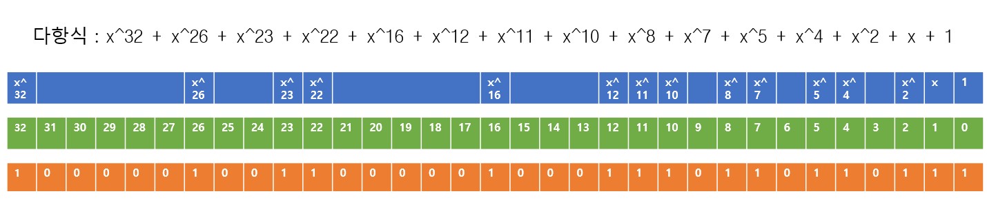 그럼 바이너리로 나오고 위의 주황색 표처럼 되는데 31번째 비트부터 읽게되면 0x4c11db7이 나오고