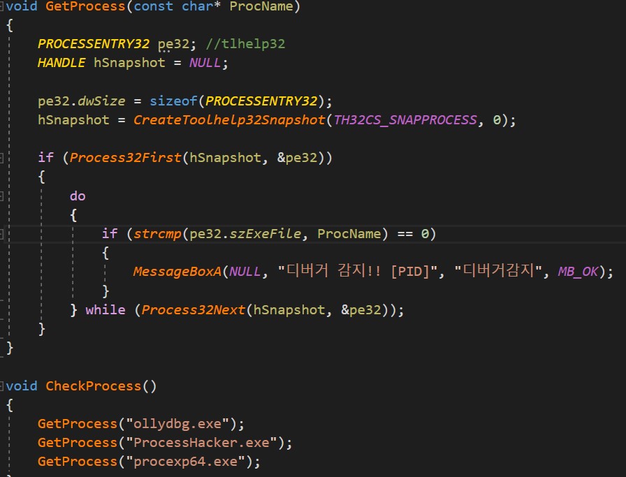 디버거의 클래스명과 윈도우명을 감지해 디버거를 감지하는 방법입니다.