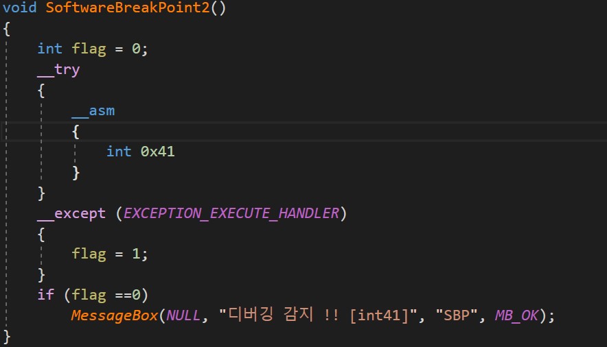 INT 41 명령어는 커널 디버거를 탐지할 때 사용되며, 보통 해당 인스트럭션은 유저모드 (RING 3) 에선 실행되지 않습니다.