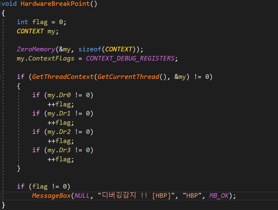 즉, Dr0 ~ Dr3 레지스터를 확인해 값이 들어있다면 하드웨어 브레이크포인트가 설정된것이라 봐도 무방합니다.