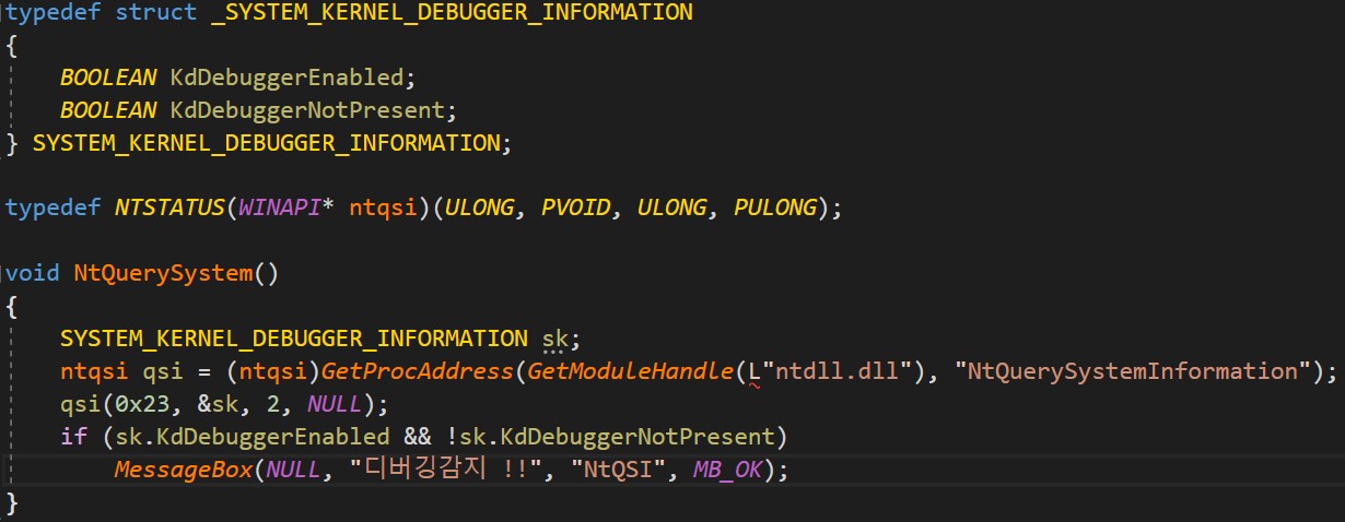 현재 운영체제의 정보들을 가져오는 함수로, OS가 디버그 모드로 부팅되었는지 아닌지를 판별하는 테크닉으로 주로 사용됩니다. 해당 클래스의 35번째에 존재하는 SystemKernelDebuggerInformation(0x23)을 이용하게되면 SYSTEM_KERNEL_DEBUGGER_INFORMATION 구조체의 DebuggerEnabled 값의 확인이 가능해집니다.