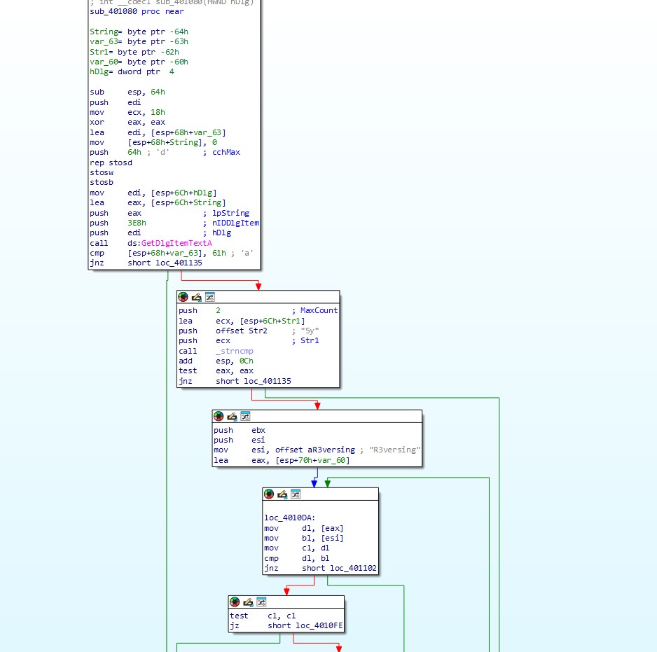 IDA에 올려 훑어보았다. 성공 실패 문자열과 위로 비교하는 구문들이 계속해 보인다.