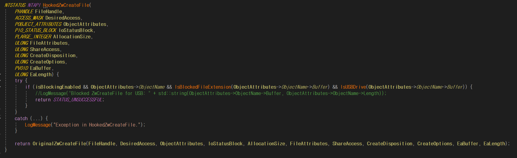 위에서 만들어둔 USB인지 .DWG 확장자인지 확인해서 맞으면 STATUS_UNSUCCESSFUL 을 반환해 버린다.